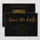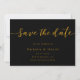 Este elegante cartão de salvamento de casamento preto e ouro é perfeito para um casamento moderno. O simples design apresenta uma elegante caligrafia dourada sobre fundo preto. O cartão também inclui um código QR para o site de casamento no verso.