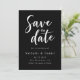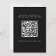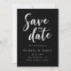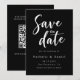 Este elegante cartão de salvamento de casamento preto-e-branco é perfeito para um casamento moderno. O simples design apresenta uma caligrafia branca elegante sobre um fundo preto. O cartão também inclui um código QR para o site de casamento no verso.