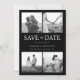 Crie o seu casamento preto e branco e guarde os cartões de data com 4 das suas fotos favoritas. Design de tipografia moderna com uma simples colagem de 4 fotos.