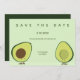 Um casamento Salve o cartão de data com um tema de abacate. Este cartão de anúncio permite que vocês dois sejam representados por abacates felizes, se preparando para começar suas vidas juntos. O esquema de cores está em tons de verde e o design tem uma mistura de capricho e moderno. Casamento de Comidas caprichosas do Avocado Salve a Data da Comida do Sweetsham | ©Melissa Patton Artist/Illustrator