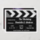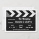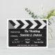 Um casamento moderno e divertido com temas negros e brancos salva o anúncio da data. O design exclusivo exibe os detalhes importantes no conselho/quadro negro do cineasta de um diretor de Hollywood e inclui espaço na parte traseira do cartão para exibir uma foto do noivado ou detalhes adicionais do casamento.