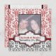 Anúncio de casamento personalizado com damasco preto, branco e vermelho. A parte superior é de padrão de damasco vermelho e branco e a parte inferior é de preto e branco. Uma faixa vermelha separa as duas partes. Seu texto é digitado em um rótulo elegante com contorno branco e vermelho.