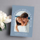O casamento de destino azul moderno salve o cartão de data com sua foto em um quadro arquivado cercado por "Faça suas Bolsas e salve a data" em um texto branco elegante. Adicione seus primeiros nomes, data do casamento e local. No lado oposto, personalize o salvamento dos detalhes da data em uma simples tipografia branca.