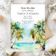 Esta elegante e bela aquarela, exceto a data do convite, apresenta uma praia, céu azul e palmeiras. O texto combina o script manuscrito e as fontes sans serif para uma aparência na moda e moderna. Isto é perfeito para uma praia de verão ou um casamento de destino tropical.