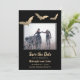 Os belos morcegos de folha de papel fazem com que este cartão "Salvar a data" se destaque. O fundo é preto com um padrão de morcego dourado. Perfeito para um gótico ou casamento de Halloween. Veja a coordenação de itens no nosso compro, Encantado Finch.