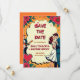 Este elegante estilo de banda desenhada, para salvar o convite de data é perfeito para um casamento moderno. O design retro apresenta uma ilustração vintage noiva e noiva e caligrafia preta em um fundo com o tema dos quadrinhos.