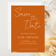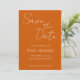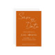 Convites de casamento de estilo simples para salvar a data que apresentam escrita estilizada branca em um fundo de cor laranja queimada na moda. Edite e substitua nomes, data e local com os seus. Selecione o tamanho do convite e o estilo de papel.