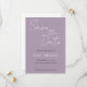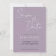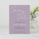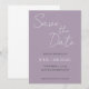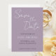 Convites de casamento de estilo simples para salvar a data que apresentam letra cursiva estilizada branca em um fundo de cor malva da moda. Edite e substitua nomes, data e local com os seus. Selecione o tamanho do convite e o estilo de papel.