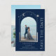 Galáxia Cósmica Casada Salva as Datas com um sol prateado prateado, lua e estrelas num fundo azul. Dentro é a sua foto favorita e o seu personalizado salva as informações de data. Adicione uma foto adicional no verso. Personalize editando o texto nas caixas de texto. Projetado por ©2022 Evco Studio www.zazzle.com/store/evcostudio