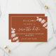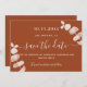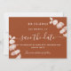 Um moderno e elegante Salve a Data para um casamento. Um fundo laranja queimado decorado com caules de eucalipto, galhos. Personalize e adicione uma data e nomes. O texto: Salvar a Data é gravado com um script de estilo com letra de tendência grande.
