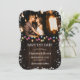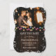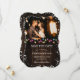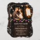 Foto de casamento de feriado no campo, salvar a data com luzes de Natal e flocos de neve em um fundo de madeira rústica. Personalize facilmente este inverno, salve a data com sua foto e detalhes do casamento.
