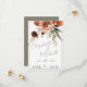 Este design de cartão de salvar a data moderno, mas rústico, apresenta um buquê superior de flores cor de rosa pêssego, ferrugem, terracota, marrom e branco. O fundo é branco com uma moldura fina verde sage; a parte de trás é um verde sage suave. Este design faz parte do conjunto de cartões Rustic Terracotta Rust Flowers Wedding Suite criado por Simply Farmhouse Press.