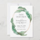 No estilo exótico dos tropicais, este casamento botânico único, exceto o cartão de data, apresenta um quadro oval de ouro duplo embelezado com folhas tropicais de bananas. O tipo de emparelhamento facial usado na modelo de texto transmite seus detalhes de casamento em estilo elegante. A parte de trás da placa é uma mistura coordenada de verde em fundo abstrato pintado com aquarela. Personalize o modelo de texto com os detalhes do casamento.