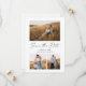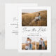 Cartão de Casamento de Foto 3 Script Moderno Save the Date. O verso inclui detalhes adicionais. Clique no botão de edição para personalizar este design com suas fotos e detalhes do casamento.