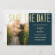 Foto de casamento única Salve a data. Fundo azul profundo (azul-oceano). Dourada inscrição (ouro não é ouro real, mas cor). Fonte moderna simplificada. Verdadeiramente único, simples e elegante. Para casamento outono, casamento de verão, casamento de jardim, ou qualquer tipo de casamento elegante moderno.