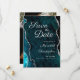 Elegante salve o cartão de data com o agato de mármore azul com a foto de casamento da reluzente prateada, salve o cartão de data. Foto do casal no verso. Anuncie seu dia especial com o nosso Agente de Prata Teal Salve o cartão Data. A frente apresenta um impressionante design de azul aqua e de pedra preciosa. A parte traseira da placa apresenta uma foto do casal. As cores ricas e os detalhes da gemstone estabelecem um tom inesquecível, enquanto a foto pessoal no verso permite que os entes queridos compartilhem seu entusiasmo desde o primeiro olhar.