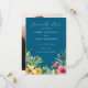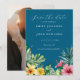 Este cartão de save-the-date de casamento de foto de flores tropicais e folhagens em aquarela azul oceano moderna e elegante pode ser personalizado com suas informações em tipografia moderna e uma foto especial no verso. Criado por Thisisnotme©