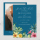 Este convite de casamento de foto de flores tropicais e folhagens em azul oceano em aquarela moderna e elegante pode ser personalizado com suas informações em tipografia moderna e uma foto especial no verso. Criado por Thisisnotme©