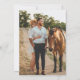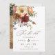 Um casamento outono maravilhosamente elegante salve o anúncio da data com "salve a data" em letra burgundy e decorado com um arranjo floral colorido de ferrugem, burgundy, laranja e pêssego com folhas verdes. Personalize com seus detalhes em burgundy font e sua foto favorita no verso.