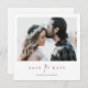 Este simples casamento de fotos quadrado chic salve a modelo do cartão de data com uma design elegante, minimalista e moderna. Procure por versões deste design em formato retangular em formatos de cartão plano, cartão postal e ímã em várias cores! A frente apresenta seus primeiros nomes sob sua foto favorita e uma mensagem 'salvar a data' veiculada com uma combinação impressionante de duas fontes distintas, com 'o' em um script luminoso e fluente entre o resto da mensagem, que está em maiúsculas com uma aparência formal arrojada e nítida.Este elemento design está incluído em ambos os lados e não pode ser alterado, embora você possa optar por apagá-lo na parte de trás para uma aparência ainda mais simples. O texto 'Salvar a Data' na frente é uma elegante sombra de burgundy, e está em preto nas costas. E no verso você pode, claro, além de substituir nossas informações de exemplo por suas próprias, excluir campos de texto que você não precisa, ou mudar o texto, bem como mudar a fonte, o tamanho e a cor. A cor padrão do texto de seus nomes na frente é preto, e o texto na parte traseira é uma mistura de preto e ligeiramente suavizado. A cor de fundo padrão em ambos os lados é definida como transparente, para permitir que a cor do papel sirva simplesmente como tom base. Mas você pode editar isso e mudar a aparência de um ou de ambos os lados nesse aspecto, bem como para se adequar ao seu estilo. Personalize este casamento elegante e minimalista, salve o modelo de cartão plano com as ferramentas intuitivas de edição do zazzle, a sua foto favorita e a sua inspiração e torne-a exclusivamente sua!