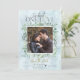 Esta elegante foto salva o cartão de ponto com imagens de aquarela eucalipto e outras folhas como um quadro em volta da foto, com "Dois Corações, Um Amor" e um anel de noivado de ouro na palavra Amor no topo. As informações do casamento Salvar a data estão abaixo da foto. O fundo é mármore azul empoeirado. Você também pode alterar a cor do anel, se desejar, clicando em Personalizar mais. Se você precisar de outros produtos correspondentes ou ajustes de design, por favor, verifique a coleção ou entre em contato comigo através do Zazzle.