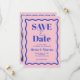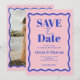 Casamento de Foto Ondulada Azul e Rosa Retro Salve a Data A tipografia em negrito adiciona um toque contemporâneo, garantindo que sua data importante se destaque com estilo. O design ondulado e ondinoso inspirado no retro traz um senso de capricho e nostalgia para o seu save the date. As curvas e torções divertidas adicionam um elemento único e memorável que fará seu cartão se destacar dos demais.