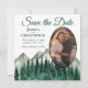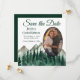 Estas belas cartões salve a data são a maneira perfeita de deixar seus amigos e família saberem sobre seu próximo casamento. Eles apresentam um design de aquarela rústica, com pinheiros verdes da floresta em primeiro plano, e picos de montanha atrás, e sua foto em forma oval. A legenda: Salvar a data com espaço para seus nomes, data e local em um plano de fundo branco clássico. O dorso é uma cor púrpura clara marmoreada.