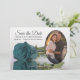 Estas belas cartas são a forma perfeita de deixar seus amigos e família saberem salvar a data do seu próximo casamento. Eles apresentam uma design romântica com uma barba, uma turquesa ou uma rosa de cor aqua escura de solteiro longo, refletindo em uma piscina de água com ondas e ondulações com sua foto em forma oval. A legenda: Salvar a data com espaço para seus nomes, data e local.