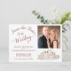 Este belo casamento Salve o cartão de datilografia apresenta um design bócio rústico com um aglomerado de rosas de aquarelas pintadas à mão, flores e folhas de eucalipto em tons de rosa poeirento, rosa-pincel e mauve. O lado esquerdo do cartão tem uma bela caligrafia escrita em que se lê "salvar a data do casamento de..." com espaço para os seus nomes, a localização e uma nota curta. À direita há espaço para sua foto acima das flores. Elegante, na moda e chic, este cartão é uma forma excelente de deixar seus amigos e família saberem salvar a data do seu dia especial.