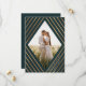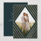 Esse belo casamento Salve a data nos convites com na moda faux douroula stripes, criando um quadro em forma de diamante geométrico ao redor da sua foto. A cor de fundo é verde escura esmeralda. Um modelo de texto é incluído no verso para mais personalização - certifique-se de personalizá-lo com a cidade e o estado!