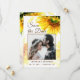 Foto de casamento Salve a data retrata uma elegante aquarela floral artística com um girassol amarelo arrojado e bonito e verde ao redor da foto do casal. A parte de trás apresenta uma citação inspiradora, "Duas vidas unidas em amizade, Dois amigos unidos em amor, Um amor unido em Cristo."