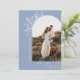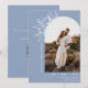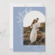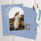 Um casamento moderno salve o anúncio da data com sua foto favorita em um arco sobre um fundo azul empoeirado com uma linha branca desenhada como buquê floral em branco atrás do arco. Adicione o seu website de casamento Código QR ao contrário.