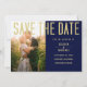 Foto de casamento única Salve a data. Fundo azul profundo (marinho azul). Dourada inscrição (ouro não é ouro real, mas cor). Fonte moderna simplificada. Verdadeiramente único, simples e elegante. Para casamento outono, casamento de verão, casamento de jardim, ou qualquer tipo de casamento elegante moderno.