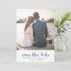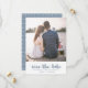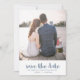 Casamento simples e chic salve o cartão de data apresenta um bonito impressão azul e branco empoeirado com tipografia de pincel. Simplesmente adicione seus nomes e sua foto favorita para tornar este design clássico seu.
