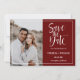 A foto elegante salva a data, apresentando sua foto vertical favorita do noivado no lado esquerdo, com os detalhes do seu casamento à direita rodeados de uma comédia branca. "Salvar a data" aparece em tipografia de escrita branca sobre fundo burgundy chic. Adicione seu nome e detalhes usando o modelo, placa inversa para uma cor de merlot correspondente com espaço para texto extra.