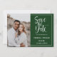 A foto elegante salva a data, apresentando sua foto vertical favorita do noivado no lado esquerdo, com os detalhes do seu casamento à direita rodeados de uma comédia branca. "Salvar a data" aparece na tipografia de script branco sobre um fundo verde escuro. Adicione seu nome e detalhes usando o modelo, a placa inversa para uma cor verde correspondente com espaço para texto extra.