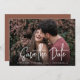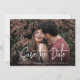 Um cartão de data moderno, projetado para acomodar sua foto favorita de noivado de sangramento horizontal ou orientada a paisagem. "Salve a data" aparece perto do fundo da sua foto em letras brancas manuscritas, com seus nomes, data do casamento e local do casamento embaixo. Cartões postais inversos para mostrar detalhes adicionais de data.