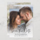 Este casamento de fotos, salvar o cartão de data, é simples e elegante, com uma foto do casal em cada lado, e a sobreposição de fontes do script de manuscrito na frente.
