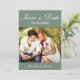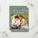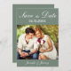 Anuncie seu casamento em estilo com esta foto personalizada moderna salve a data com o roteiro de caligrafia branco com sua data de casamento e outros detalhes para personalizar em um fundo verde sábio. Desenhada por Susan Coffey.