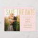 Foto de casamento única Salve a data. Plano de fundo rosa embebido. Dourada inscrição (ouro não é ouro real, mas cor). Fonte moderna simplificada. Verdadeiramente único, simples e elegante. Para o casamento de verão, casamento de primavera, ou qualquer tipo de casamento elegante moderno.