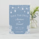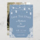Este lindo azul empoeirado salve o cartão de encontro com luzes de cordas e jarras de pedras no topo e belas bordas de renda no fundo da frente e sua foto no fundo é perfeita para seus anúncios de casamento. É leve, arejada e encantadora. As fontes são nítidas e modernas enquanto são clássicas e tradicionais. É perfeito para qualquer tema de casamento. Os convidados ficarão encantados em compartilhar sua alegria e felicidade e ficarão felizes em ser incluídos no seu casamento. É tão fácil fazer o seu. Basta selecionar Personalizar este modelo, digitar as suas informações, carregar a sua fotografia favorita e, em segundos, poderá ver os seus cartões salve a data únicos e bonitos.