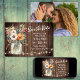 Esse casamento rústico Salve a Data apresenta um arranjo de flores silvestres bonito em um pote de mason com uma simples fita de luzes de cordas contra um fundo de madeira. Adicione a sua foto favorita à parte traseira desta opção Salvar a data.