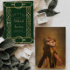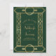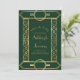 Este elegante casamento inspirado em vintage Salve o cartão de data com texto dourado em um fundo verde esmeralda escuro, enquadrado por uma borda geométrica de arte na moda vintage deco em folha de ouro falsa. Substitua a imagem de exemplo no verso por sua foto vertical favorita.