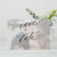 O moderno minimalista romântico preto e branco com letra chic manuscrita caligrafia manuscrita salvou a data modelo da carta horizontal com a sua camada de fotos personalizada. ++++++++++ Fácil de personalizar com seus detalhes, código QR (gerado automaticamente com seu endereço Web) e sua imagem de noivado em ambos os lados! ++++++++ Adequado para primavera de outono de verão ou casamentos clássicos elegantes de inverno.