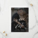 Um casamento preto moderno e romântico com o moody Chic salve a modelo da data com a sua foto personalizada em trendy faux vellum obscuro com um roteiro de caligrafia branco com letras brancas. ++++++++++ Fácil de personalizar com seus detalhes e imagem de noivado em ambos os lados! +++++++++ Adequado para qualquer tema de casamento elegante de estação.