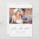 Moderno salve o script de data e a linha fina de quadro em azul marinho editável a cores, com foto do casal, simples e elegante. cartões salve a data de excelente para casamento moderno e outros eventos. Selecione "Clique para personalizar mais" na seção "Personalizar este modelo" para ajustar a posição e o tamanho da sua foto.
