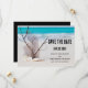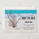 Salve o cartão de data com uma bela fotografia. Água azul tropical e surf de espuma no fundo. Uma coleção de conchas e caules em uma praia branca de areia.