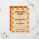Uma única borda ondulada neste casamento ranzinza Salve a Data. Laranja queimada, vermelho e acastanhado. Totipografia retrorreflectora em negrito para um anos setenta retrorreflector sentir. A parte de trás do cartão é cor de laranja com a mesma borda curva, o seu monograma. um painel onde você pode adicionar mais informações, e um código QR para que os convidados possam visitar seu site de casamento. Design: as cores da Jeannie: Creme, laranja, vermelho e browsers