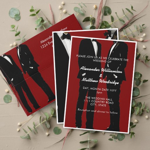 Simples, moderno e elegante. Dois homens, com confiança, eternos desportivos, traduzem uma narrativa de amor e compromisso eterno. A paleta eterno e na moda preto e branco é elegantemente complementada por uma caligrafia subestimada e um fundo vermelho ousado. Esta design pode ser aplicada sem problemas a essências do casamento, como guardar as datas, convites para o casamento, programas de casamento, cartas de agradecimento, menus de recepção, decoração de casamento personalizada. Para obter suporte para personalização, envie um e-mail para remidevandesigns@gmail.com RemideVan©
