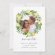 Elegante botânico salva as datas tem uma foto de noivado favorita cercada por uma coroa redonda de limões citros e folhas numa elegante paleta de aquarela de amarelo, verde e branco. Personalize com seus nomes, data do casamento e local.